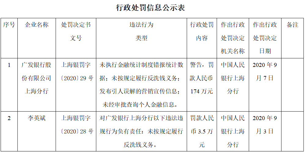 日前, 中国人民银行上海分行发布了行政处罚信息公示表,广发银行因多项违法行为被人行警告并处罚款174万,两名负责人分别被罚3.5万元。