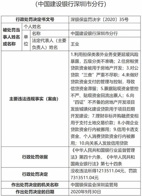 近日,根据银保监会最新公布的行政处罚信息显示,建行深圳分行因十项违法违规事项被罚款7313511.04元,罚没收违法所得1213511.04元,成为今年10月以来银保监会开的金额最大罚单。