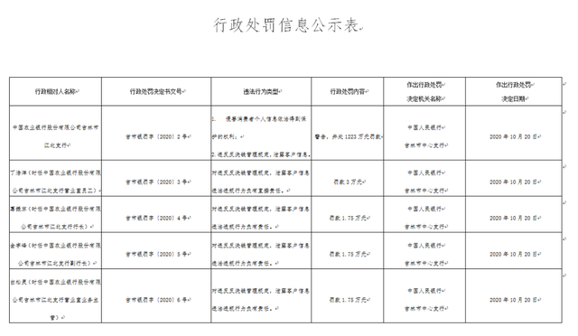 一、央行公示信息显示,中国农业银行股份有限公司吉林市江北支行存在的违法行为类型有:1、侵害消费者个人信息依法得到保护的权利;2、违反反洗钱管理规定,泄露客户信息。央行对其给予警告,并处1223万元罚款。该支行时任行长、副行长、营业室业务主管和员工,分别被罚1.75万元至3万元不等。