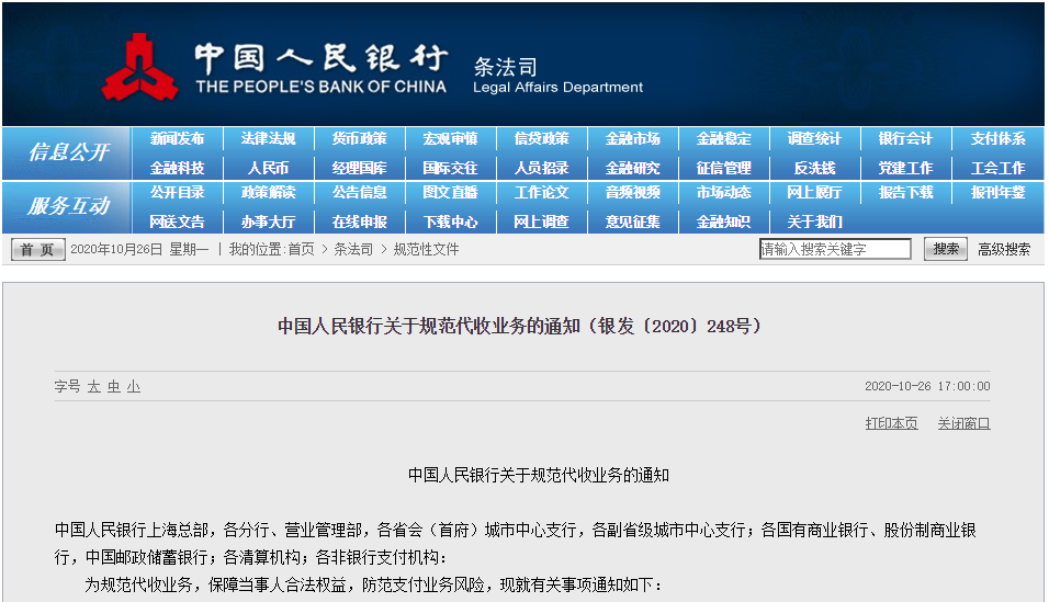 2020年10月26日晚间五点,央行发布《中国人民银行关于规范代收业务的通知》(银发〔2020〕248号),对代收进行严格规范。根据这个新规,代收业务未来不得为不具备放贷资质的机构提供此项服务。