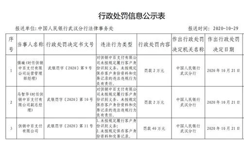 10月29日消息,人民银行武汉分行公布的行政处罚信息公示表显示,供销中百支付有限公司因未按规定履行客户身份识别义务;未按规定保存客户身份资料和交易记录,被处罚款40万元。同时,时任供销中百支付有限公司副总经理马智华、运营管理部经理强璇对上述行为负责,分别被处罚款2万元。