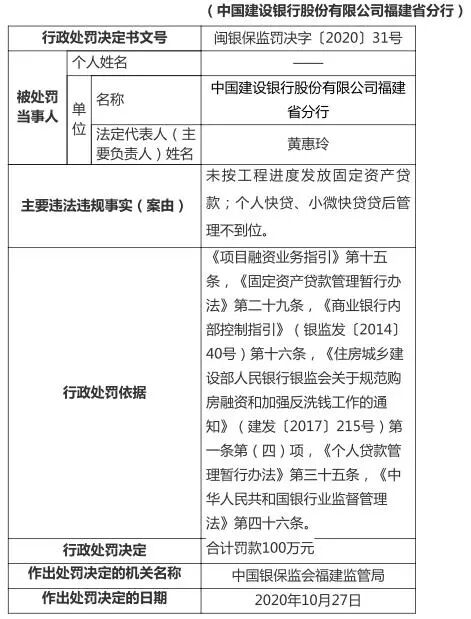 银保监会网站今日公布对中国建设银行股份有限公司福建省分行(以下称“建设银行福建分行”)的行政处罚决定。闽银保监罚决字〔2020〕31号显示,建设银行福建分行未按工程进度发放固定资产贷款;个人快贷、小微快贷贷后管理不到位,被中国银保监会福建监管局合计罚款100万元。