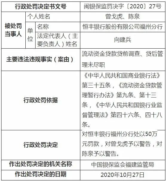罚单显示,恒丰银行股份有限公司福州分行的主要违法违规事实是流动资金贷款贷前调查、贷后管理未尽职,根据《中华人民共和国商业银行法》第三十五条,《流动资金贷款管理暂行办法》第九条、第十三条,《中华人民共和国银行业监督管理法》第四十六条、四十八条,福建银保监局对对恒丰银行福州分行处以50万元罚款,对曾戈虎予以警告,对陈泉予以警告。