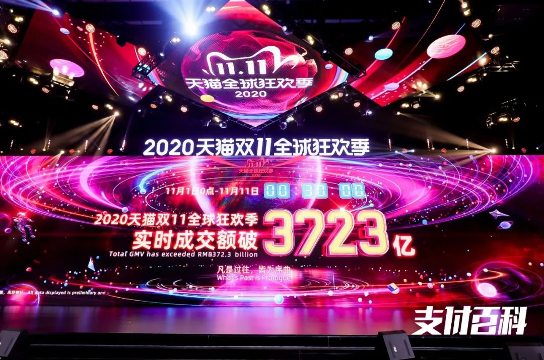 11月11日0点30分,2020年天猫双11的成交总额突破3723亿元人民币,与以往不同,此次天猫双11周期从11月1日0点开始计算,而在去年双11当天成交额为2684亿元。