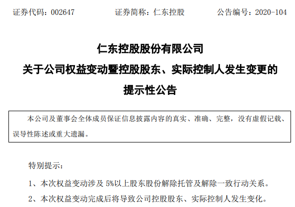11月17日晚间仁东控股(002647.SZ)发布公告,公司控股股东北京仁东信息技术有限公司(以下简称“仁东信息”)与北京海淀科技金融资本控股集团股份有限公司(以下简称“海科金集团”)签署的表决权委托协议一年期满,双方将不再续签。