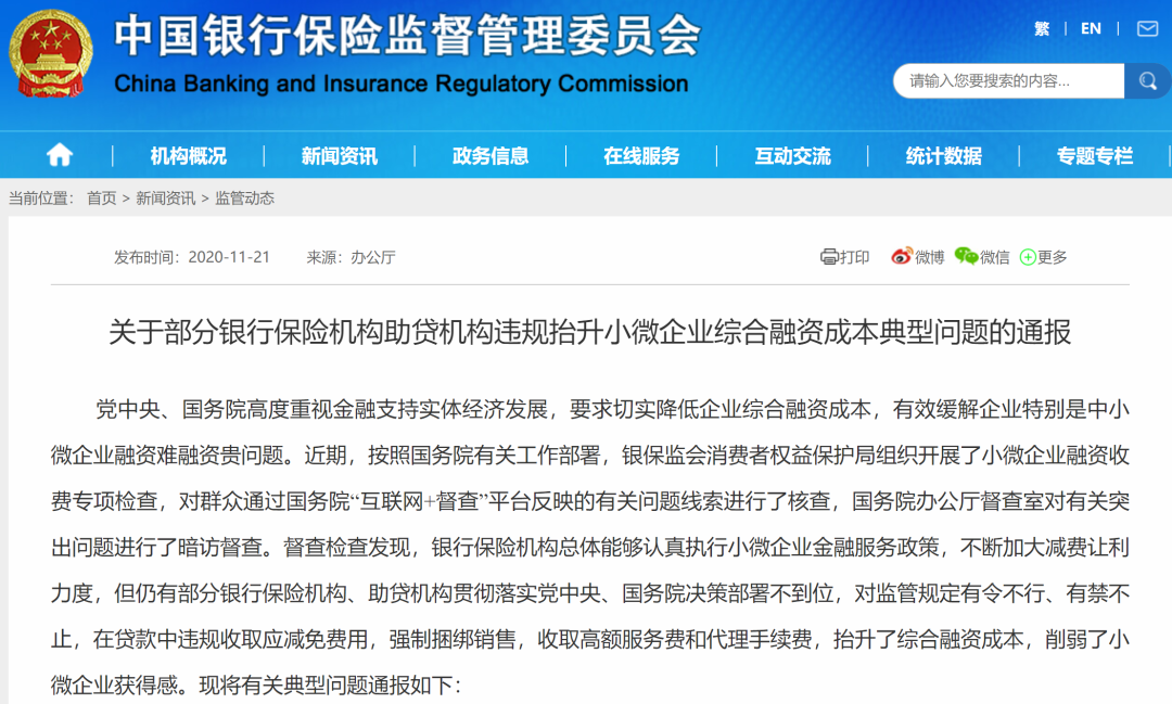 11月21日,国务院办公厅督查室、中国银保监会办公厅通报了有关部分银行保险机构、助贷机构违规抬升小微企业综合融资成本的典型问题。