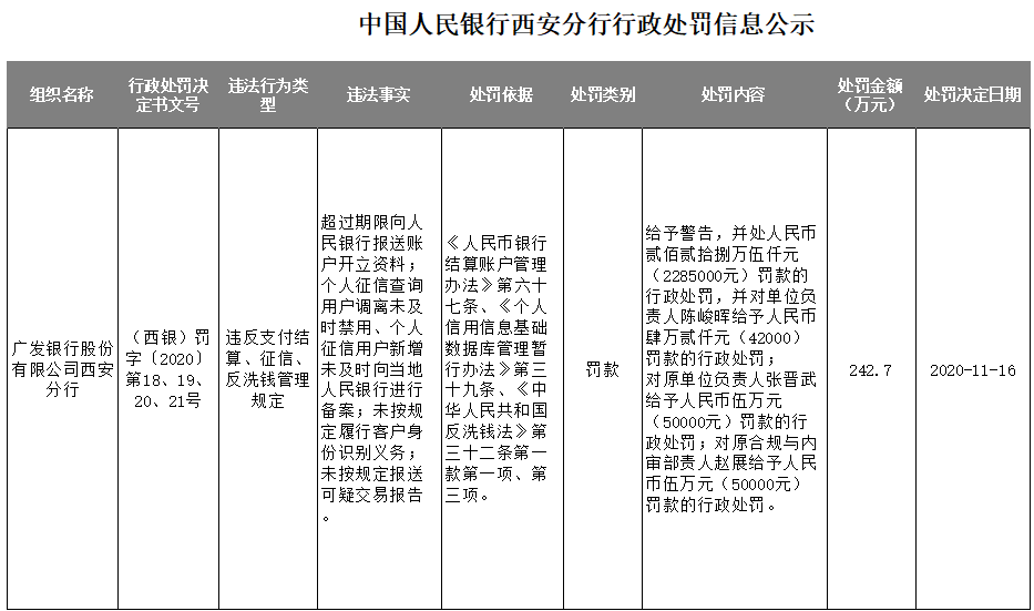 对此,中国人民银行西安分行对广发银行西安分行给予警告,并处人民币2285000元罚款的行政处罚,并对单位负责人陈峻晖给予人民币42000罚款的行政处罚;对原单位负责人张晋武给予人民币50000元罚款的行政处罚;对原合规与内审部责人赵展给予人民币50000元罚款的行政处罚。
