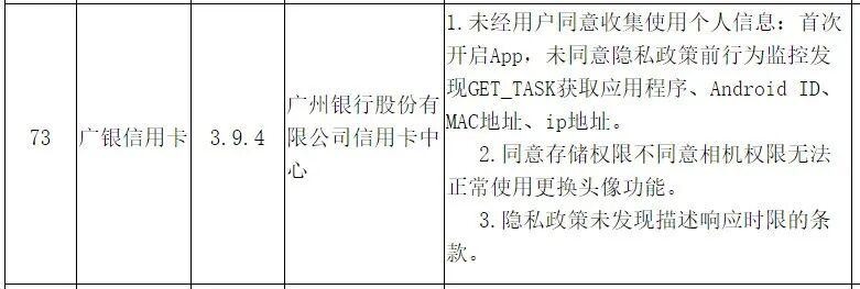 另外,广州银行信用卡中心旗下“广银信用卡”App因存在“未经用户同意收集使用个人信息”、“同意存储权限不同意相机权限无法正常使用更换头像功能。”、“隐私政策未发现描述响应时限的条款”等问题被通报。