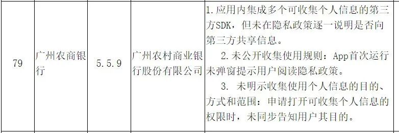 广州农村商业银行旗下“广州农商银行”因“应用内集成多个可收集个人信息的第三方SDK,但未在隐私政策逐一说明是否向第三方共享信息”、“App首次运行未弹窗提示用户阅读隐私政策”、“申请打开可收集个人信息的权限时,未同步告知用户其目的”等问题被通报。
