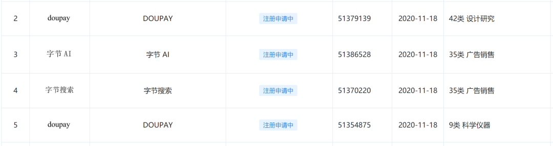 除了申请DOUPAY的商标外,去年7月份,字节跳动还申请了抖音支付的商标,商标局核准了抖音支付在42类注册,在9类的注册申请中被驳回。