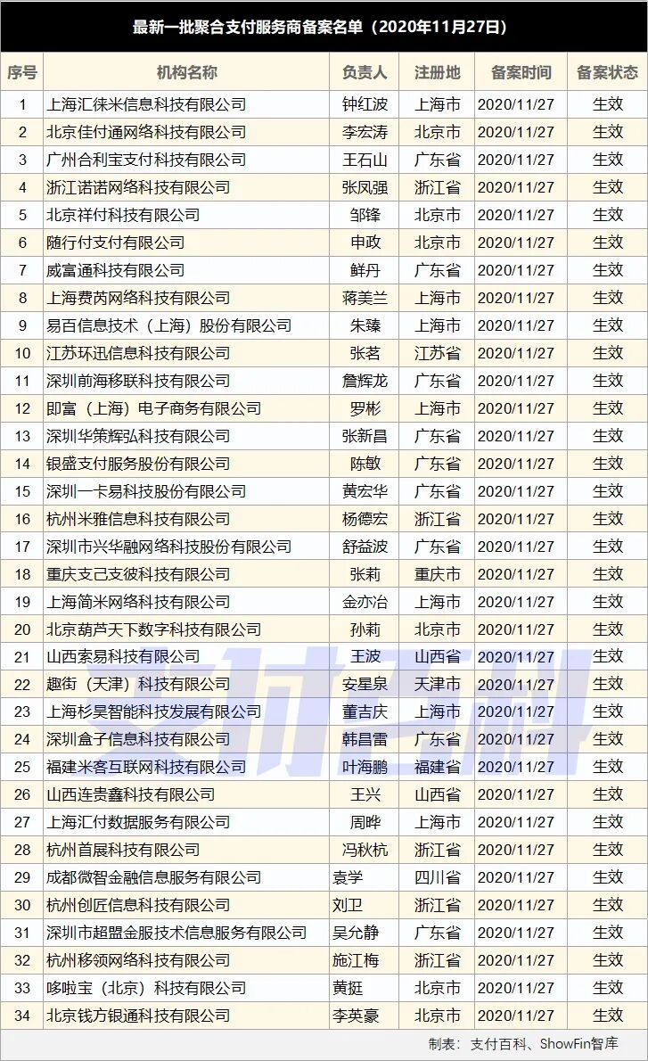 最先公布的第一批通过备案的收单外包服务机构名单中,拉卡拉支付股份有限公司、银联商务股份有限公司、武汉利楚商务服务有限公司、北京微美汇通信息技术有限公司、你好现在(北京)科技股份有限公司、上海收钱吧互联网科技有限公司、陕西浦思金融网络科技有限公司、福州四九八网络科技有限公司、长沙卡友信息服务股份有限公司、网联商务有限公司、杭州腾纵科技有限公司等 11家机构被批准经营聚合支付服务。