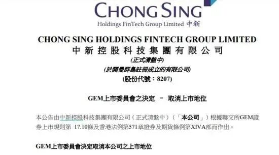 近日,先锋支付母公司中新控股公布公告,该公司股份的最后上市日期为2020年11月27日及股份的上市地位将自2020年11月30日上午九时正起取消。