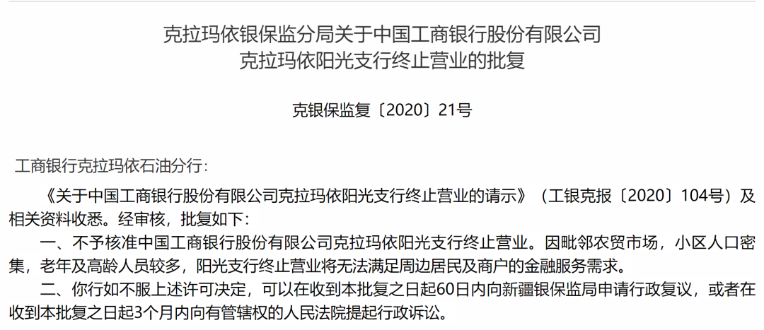 在申请终止营业的诉求被驳回后,工商银行克拉玛依分行发表回应,表示将坚持服务为民,合理优化网点布局,为客户提供线上线下多种渠道服务。