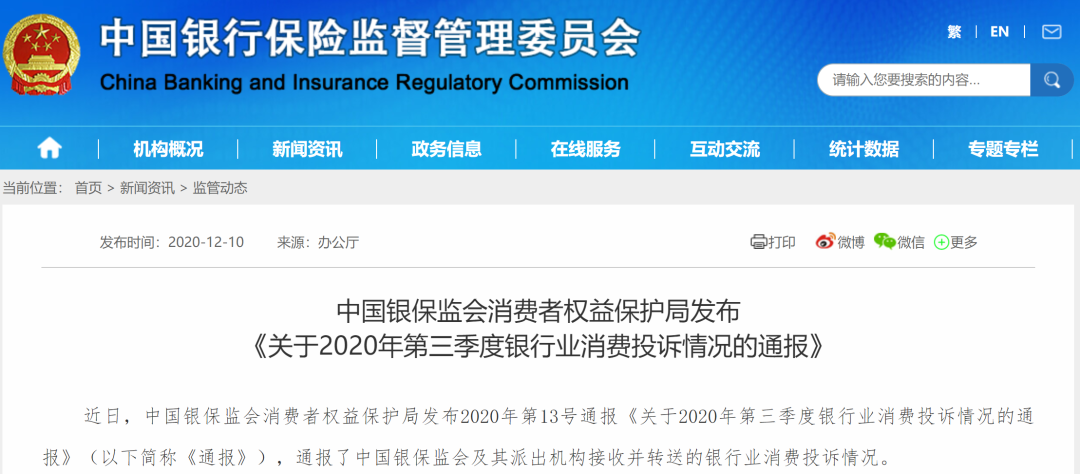 近日,中国银保监会消费者权益保护局发布2020年第13号通报《关于2020年第三季度银行业消费投诉情况的通报》(以下简称《通报》),通报了中国银保监会及其派出机构接收并转送的银行业消费投诉情况。