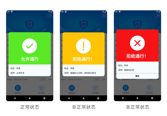 在应用场景中,流动人员在重点管控区域出示“健康码”, APOS A5快速扫描识别,当健康码为绿色正常状态,即完成人员信息登记,并提示“准予放行”;当用户健康码为黄色或红色的非正常状态,APOS A5终端将提示“拒绝通行”,工作人员按规定进行相应处置。该方案有效解决了人工登记的真实性、隐私性、复杂繁琐等问题,同时实现了信息自动采集、信息数字化及动态联动,为各场景下的精准防控提供科技支持。