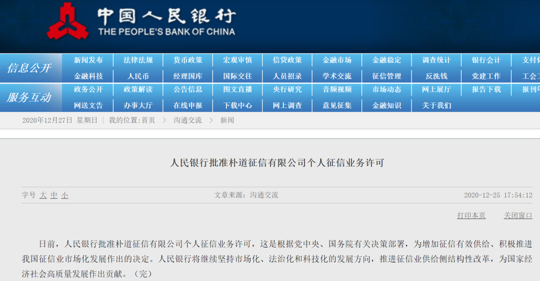 12月4日,央行受理了朴道征信有限公司(筹)的个人征信业务申请,12月25日人民银行发布公告称,正式批准朴道征信有限公司个人征信业务许可。