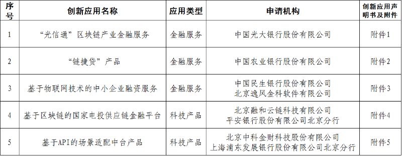 本次公布的5个创新应用分别为:光大银行申请的“光信通”区块链产业金融服务、农业银行“链捷贷”产品、民生银行与北京逸风金科软件有限公司推出的“基于物联网技术的中小企业融资服务”,以及北京融和云链科技有限公司与平安银行北京分行推出的“基于区块链的国家电投供应链金融平台”、北京中科金财科技股份有限公司与浦发银行北京分行推出的“基于API的场景适配中台产品”。