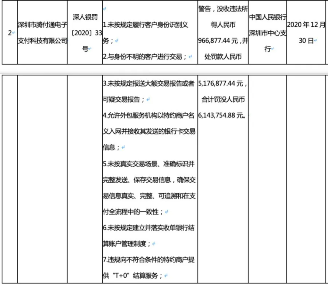 近日,中国人民银行深圳市中心支行发布的行政处罚表显示,深圳市腾付通电子支付科技有限公司涉11项违规被警告,没收违法所得人民币966,877.44元,并处罚款人民币5,176,877.44元,合计罚没人民币6,143,754.88元。同时刘京霖(时任深圳市腾付通电子支付科技有限公司内控合规部负责人)被罚18万元。