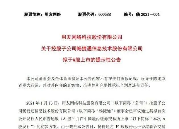 1月13日,用友网络发布公告,其控股子公司畅捷通信息技术股份有限公司拟首次公开发行人民币普通股(A 股),这也意味着畅捷通将在A股上市。
