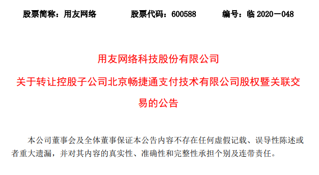 去年7月份,用友网络发布公告,称公司将聚焦于云服务主业,拟将持有控股子公司北京畅捷通支付技术有限公司80.72%的股权转让给关联方北京用友融联科技有限公司,转让价格为2.98亿元。