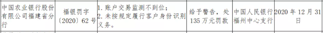 中国农业银行股份有限公司福建省分行因账户交易监测不到位;未按规定履行客户身份识别义务,受到警告处分并被罚款135万元。