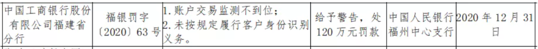 中国工商银行股份有限公司福建省分行因账户交易监测不到位;未按规定履行客户身份识别义务,受到警告处分并被罚款120万元。