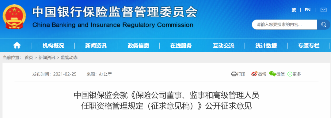 附:中国银保监会就《保险公司董事、监事和高级管理人员任职资格管理规定(征求意见稿)》公开征求意见