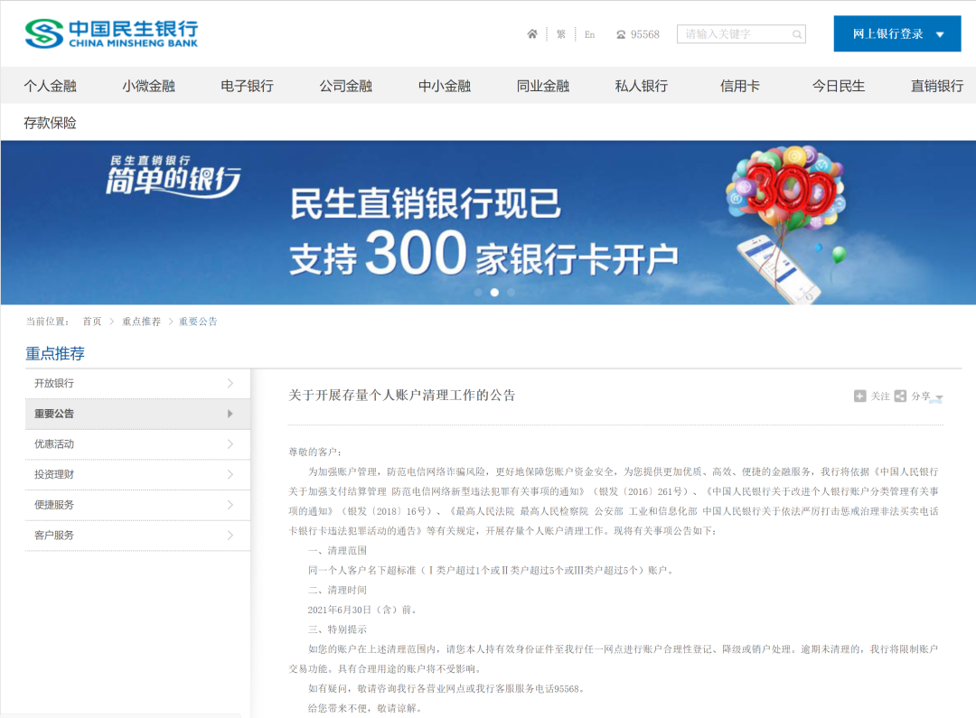 2月22日,民生银行发布公告,将清理同一个人客户名下超标准(Ⅰ类户超过1个或Ⅱ类户超过5个或Ⅲ类户超过5个)账户,清理时间为2021年6月30日前。