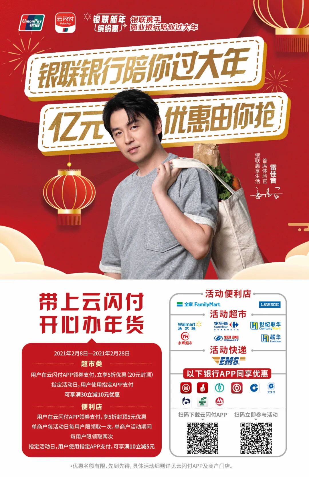 针对春节及春节后一段时间的消费特性,银联选取了日常生活中高频的消费场景,本次活动覆盖了超市、便利店、餐饮、物流、娱乐等领域,用户在消费过程中可享受到折扣、满减等多种优惠。