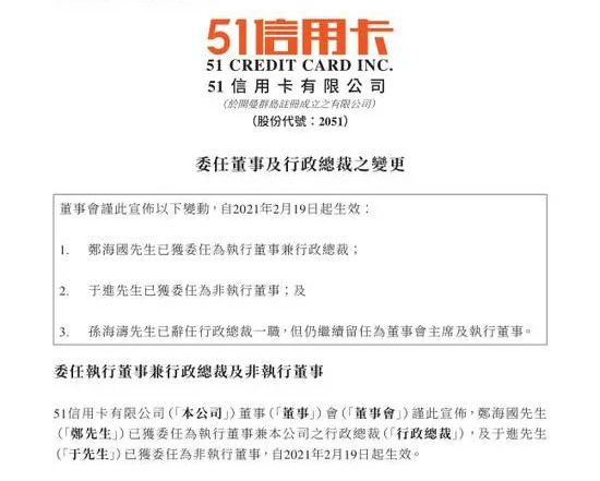 从2021年2月19日起,孙海涛已辞任行政总裁一职,此次高管变动目的是为了引入更多专业人才,并进行精细化分工和管理,从而推动51信用卡的稳定发展。