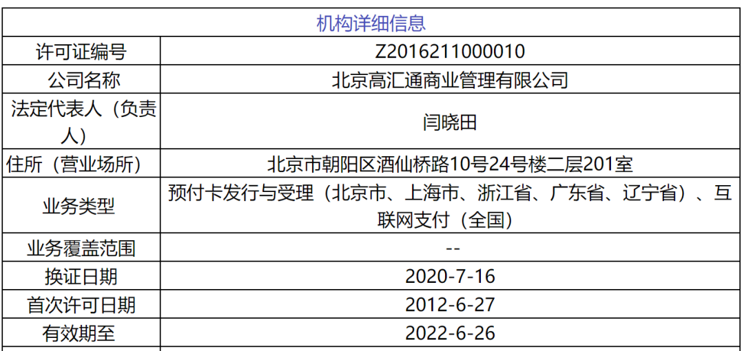 北京高汇通商业管理有限公司在2012年获得央行颁布的支付牌照,被批准开展全国范围的互联网支付业务以及北京市、上海市、浙江省、广东省、辽宁省的预付卡发行与受理业务。