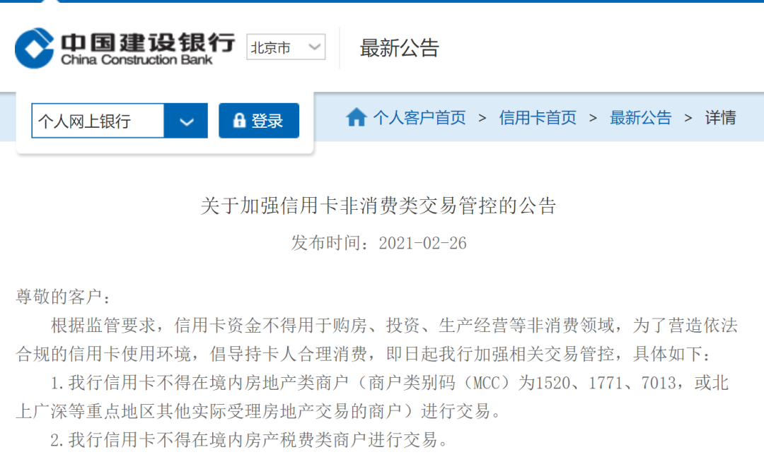 在建设银行的公告中,涉房类交易成为重点管控的领域,建行明确表示信用卡不得在商户类别码(MCC)为1520、1771、7013的房地产类商户进行交易,同时也不得在境内房产税费类商户进行交易。