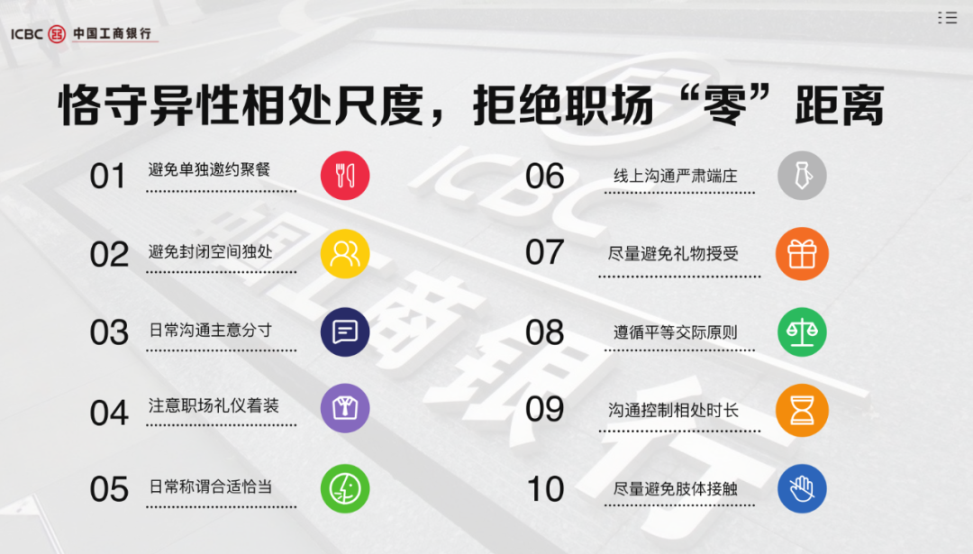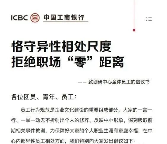 震惊银行业!工行发布最强员工行为规范 小百 • 2021-03-04 支付图文 3月2日下午,有网友爆料:中国工商银行发布内部倡议,提示要“恪守异性相处尺度,拒绝职场‘零’距离”。 《倡议书》写明了10条准则: 有人认为,这种倡议有点“严格”了: 也有人表示,这在一定程度上避免了职场性骚扰: 合作/客服微信:baike2999 ▼进群加微信:baike2888 点击下方卡片关注支付百科 编辑:小百,转载请注明出处:https://www.paybaike.com/?p=3570 0 扫一扫,分享到微信 猜你喜欢 未央今日播报:“固收+”基金迎监管新规范 支付宝公布小微商家降费进展 未央今日播报:三部门发文规范网络直播营利行为 淘宝App内测微信支付 移动支付干掉线下终端,ATM龙头转型难