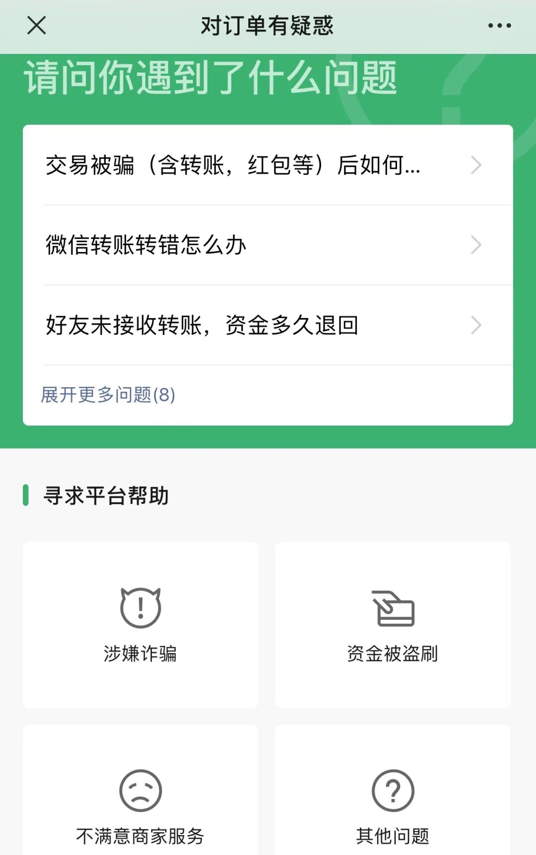 据「支付百科」测试,打开微信钱包中的账单页面,找到待入账的一笔订单,点击下方「对订单有疑惑」选项,便可进入投诉页面,点击下方「涉嫌诈骗」即可进行投诉,其中投诉原因可选择“网络交友”“仿冒身份”“金融诈骗”等选项,可见微信对于欺诈投诉方面的功能比较完善,但也给了骗子可乘之机。