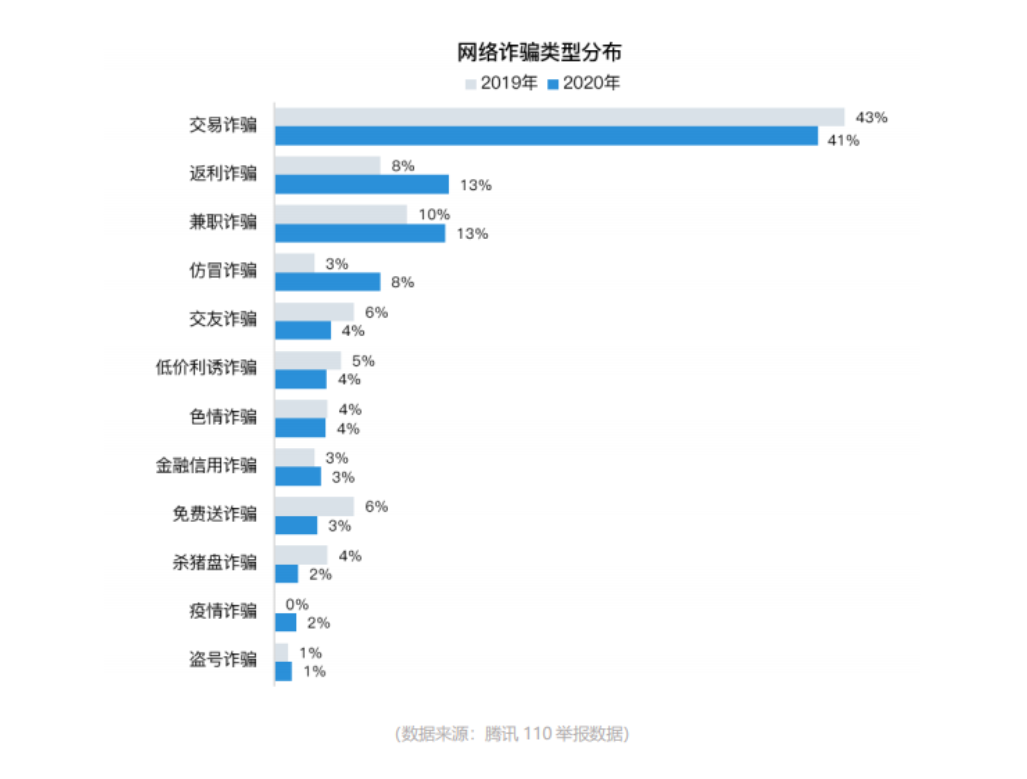 腾讯旗下腾讯110网络安全团队近日发布《2020网络诈骗治理报告》,指出交易诈骗仍居所有网络诈骗类型中首位。