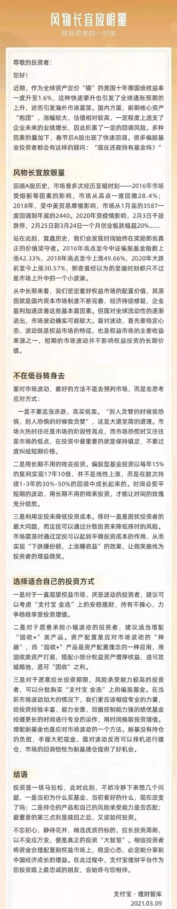 近期基金市场大幅波动,成为基民关注的焦点。3月9日晚间,支付宝理财智库发出投资者信,并与多家基金公司一起再次提醒网友理性投资。