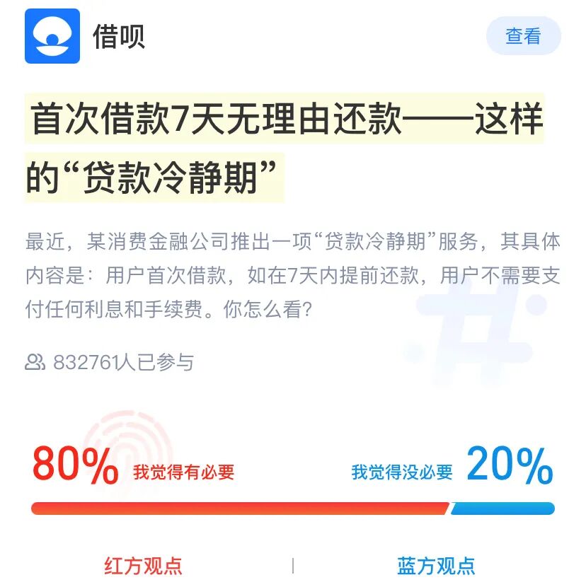 借呗称,“最近某消费金融公司推出贷款冷静期服务,用户首次借款,如在7天内提前还款,不需支付任何利息和手续费,你怎么看?”借呗通过意见征集,很可能也会推出类似的贷款冷静期服务。