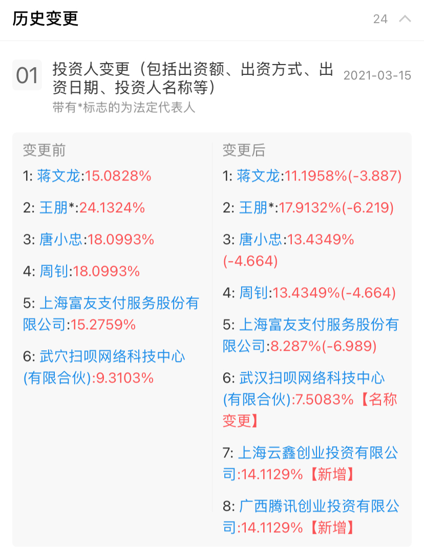 其中,王朋持股17.91%并控股武汉扫呗网络科技中心(有限合伙),实为利楚扫呗的大股东、实际控制人。新增股东上海云鑫创业投资有限公司持股14.11%,上海云鑫创业投资有限公司由蚂蚁科技集团股份有限公司全资控股;新增股东广西腾讯创业投资有限公司持股14.11%,广西腾讯创业投资有限公司由深圳市腾讯产业投资基金有限公司全资控股。同时,富友支付持股比例由变更前的15.28%被稀释至8.29%。
