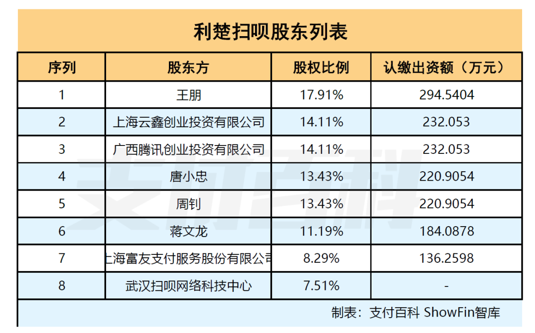 其中,王朋持股17.91%并控股武汉扫呗网络科技中心(有限合伙),实为利楚扫呗的大股东、实际控制人。新增股东上海云鑫创业投资有限公司持股14.11%,上海云鑫创业投资有限公司由蚂蚁科技集团股份有限公司全资控股;新增股东广西腾讯创业投资有限公司持股14.11%,广西腾讯创业投资有限公司由深圳市腾讯产业投资基金有限公司全资控股。同时,富友支付持股比例由变更前的15.28%被稀释至8.29%。