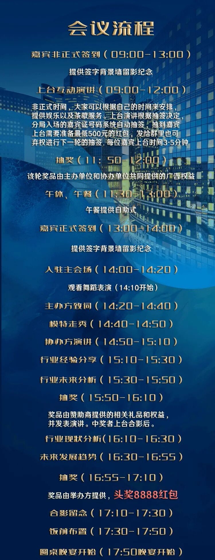 在本次大会提供的交流以及人脉资源共享平台上,采取上台互互动演讲形式,每位嘉宾上台时间3-5分钟,上台演讲根据抽签决定,结果由入场的嘉宾证号码抽签产生,大会将准备娱乐以及茶歇服务。