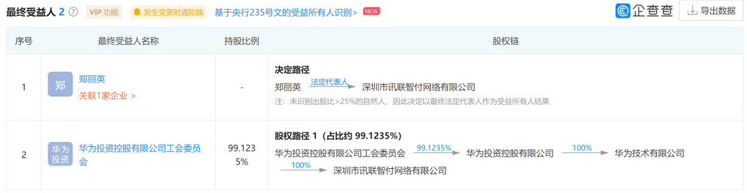 此外,企查查信息显示,华为投资控股有限公司工会委员会为最终受益人,华为投资控股有限公司工会委员会直接控制华为技术有限公司,从而间接持有讯联智付99.1235%的股份。