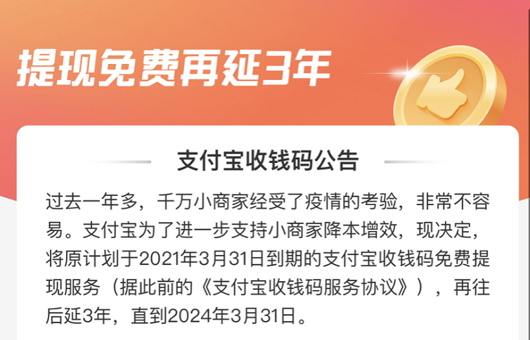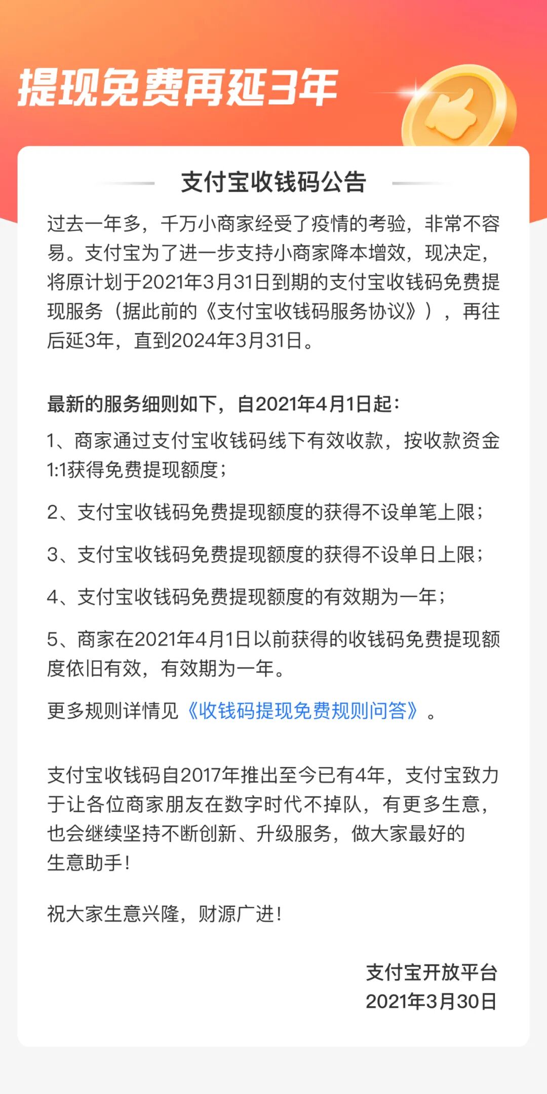支付宝公告称,支付宝为了进一步支持小商家降本增效,现决定,将原计划于2021年3月31日到期的支付宝收钱码免费提现服务,再后延3年,直到2024年3月31日。