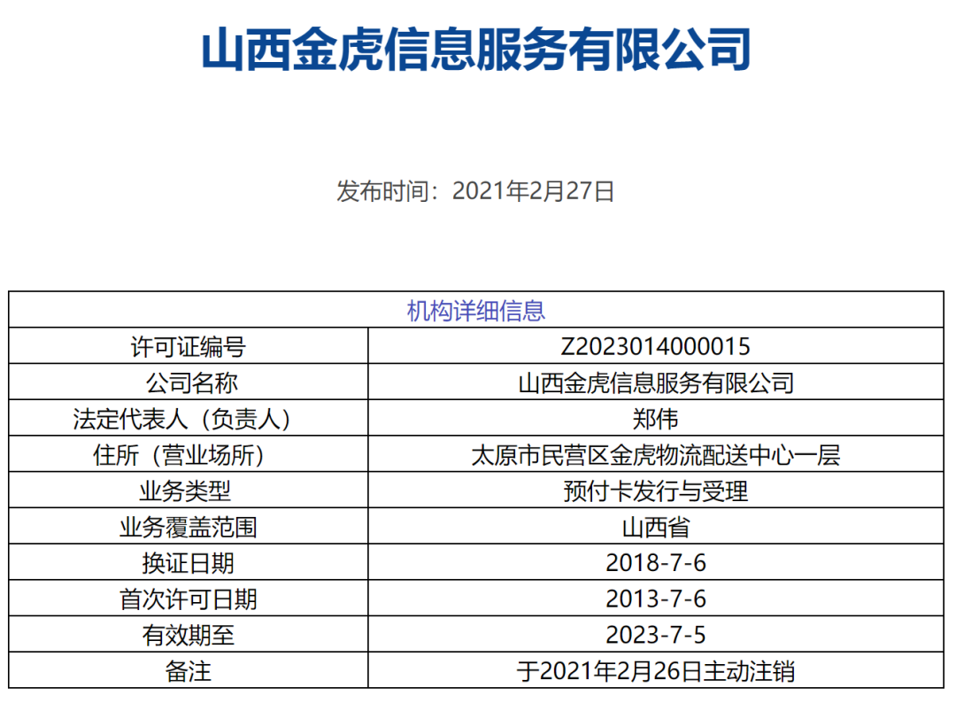 山西金虎信息服务有限公司于2013年获得央行颁发的支付牌照,牌照类型为预付卡发行与受理,2018年7月份,山西金虎信息服务有限公司顺利通过支付牌照续展,牌照有效期延至2023年7月。