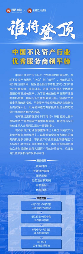 会议还设有《中国不良资产行业优秀服务商领军榜》环节,目前我们已收到二十余家服务商的自荐材料,继续火热招募各路优秀服务商报名参与评选,速戳联系人垂询或扫描下方二维码报名。