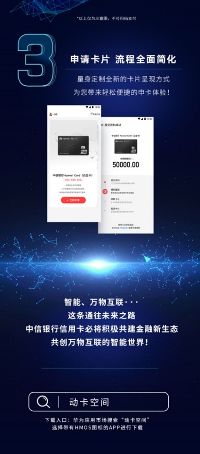 2020年,中信银行再次与华为合作,联手发行联名信用卡中信银行Huawei Card,这是一张结合华为场景打造的“手机中的信用卡”,使信用卡真正脱离了对实体卡片的依赖。