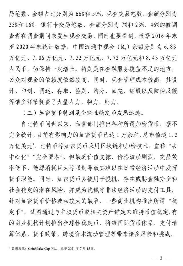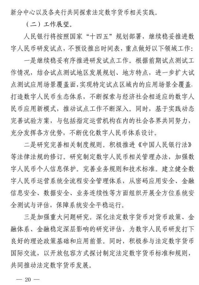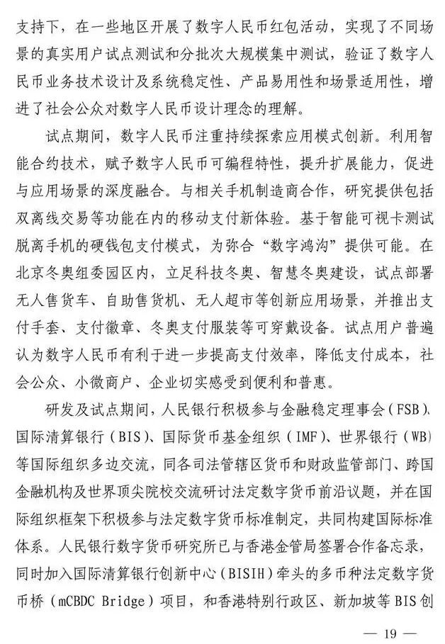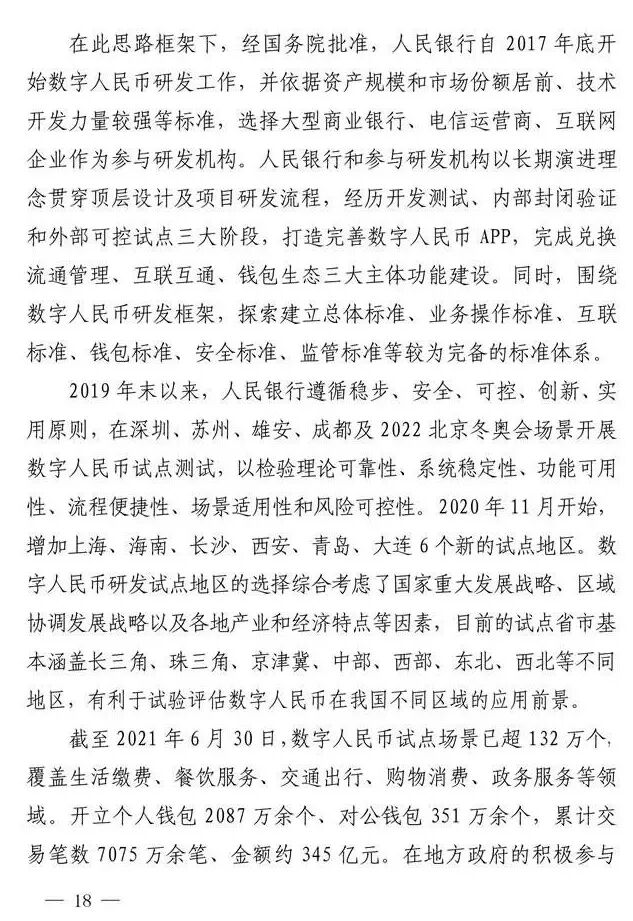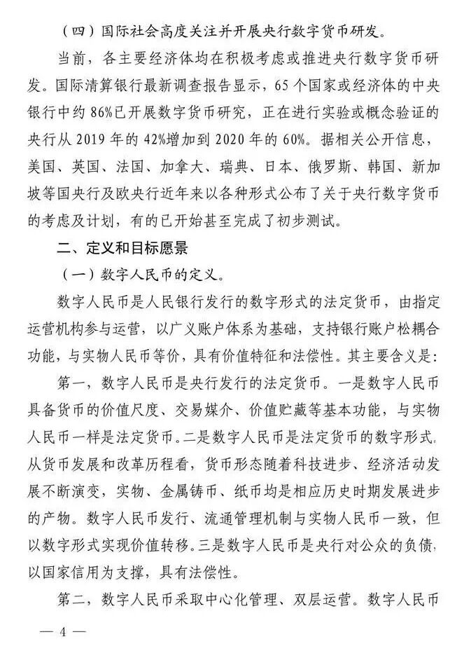 中国人民银行(以下简称人民银行)高度重视法定数字货币的研究开发。2014年,成立法定数字货币研究小组,开始对发行框架、关键技术、发行流通环境及相关国际经验等进行专项研究。2016年,成立数字货币研究所,完成法定数字货币第一代原型系统搭建。2017 年末,经国务院批准,人民银行开始组织商业机构共同开展法定数字货币(以下简称数字人民币,字母缩写按照国际使用惯例暂定为“e-CNY”)研发试验。目前,研发试验已基本完成顶层设计、功能研发、系统调试等工作,正遵循稳步、安全、可控、创新、实用的原则,选择部分有代表性的地区开展试点测试。