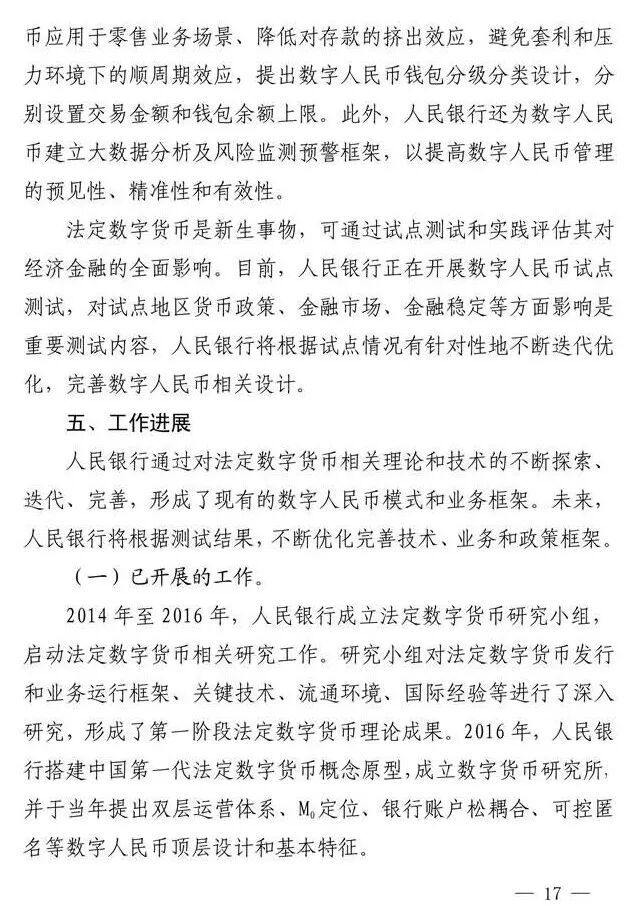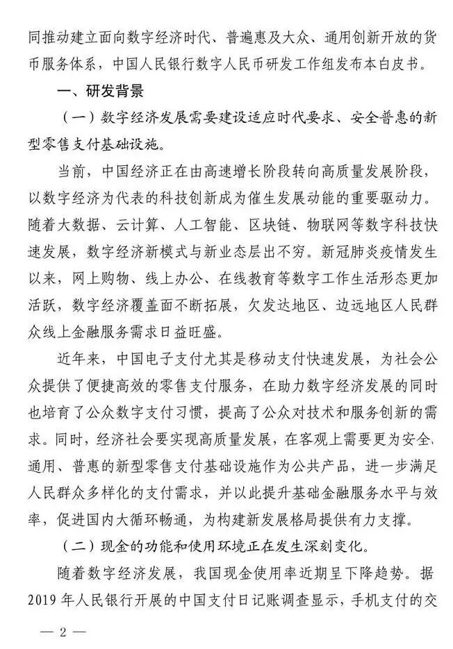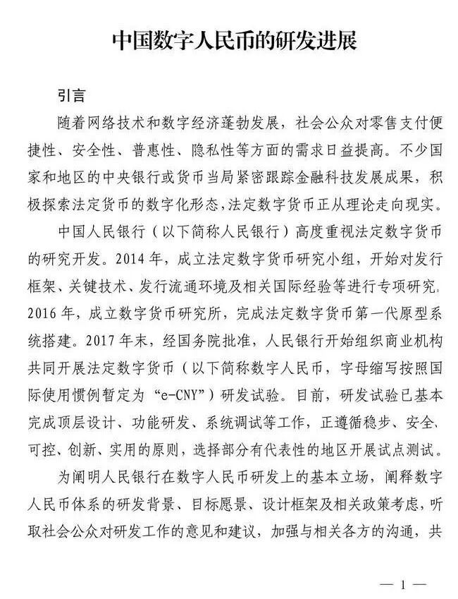 为阐明人民银行在数字人民币研发上的基本立场,阐释数字人民币体系的研发背景、目标愿景、设计框架及相关政策考虑,听取社会公众对研发工作的意见和建议,加强与相关各方的沟通,共同推动建立面向数字经济时代、普遍惠及大众、通用创新开放的货币服务体系,中国人民银行数字人民币研发工作组发布本白皮书。