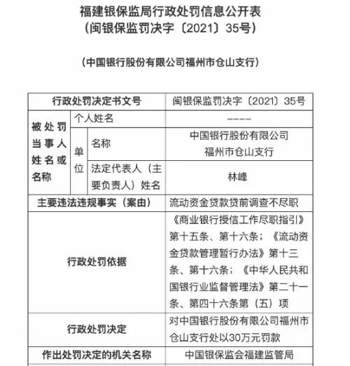 闽银保监罚决字〔2021〕35号罚单显示,中国银行股份有限公司福州市仓山支行因流动资金贷款贷前调查不尽职,中国银保监会福建监管局根据《商业银行授信工作尽职指引》第十五条、第十六条;《流动资金贷款管理暂行办法》第十三条、第十六条;《中华人民共和国银行业监督管理法》第二十一条、第四十六条第(五)项,对中国银行股份有限公司福州市仓山支行处以30万元罚款。
