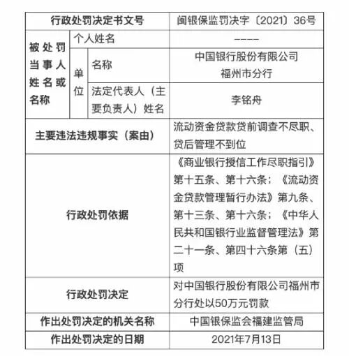 同样因为流动资金贷款贷前调查不尽职、贷后管理不到位等违法违规事实,中国银行股份有限公司福州市分行被中国银保监会福建监管局处以50万元罚款。