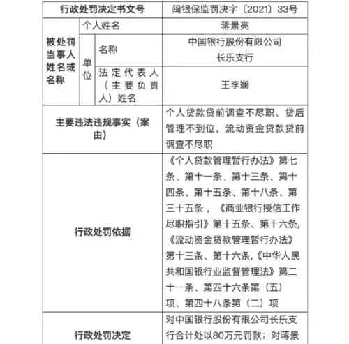 此外,中国银行股份有限公司长乐支行也遭福建监管局合计处罚80万元,其主要违法违规事实为个人贷款贷前调查不尽职、贷后管理不到位,流动资金贷款贷前调查不尽职。同时,福建监管局还对相关涉事人员给予警告,并处5万元罚款。